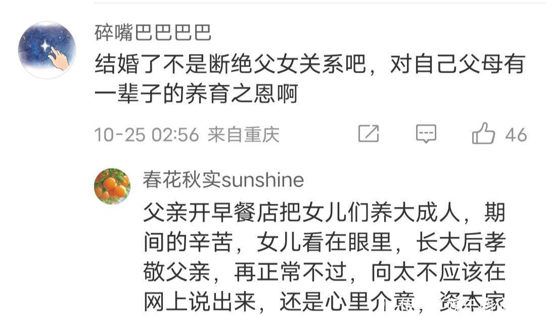 还有人说结婚了又不是断绝父女关系,儿女对自己的父母有一辈子的养育之恩。